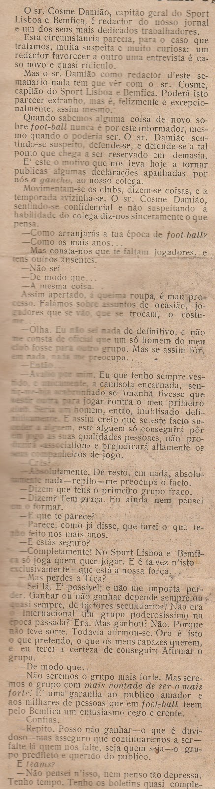 Cosme Damião antes do início da temporada de 1914/15 dizia que o SLB podia não ser o grupo mais forte. Mas de certeza que era o grupo com mais vontade de ser o mais forte!