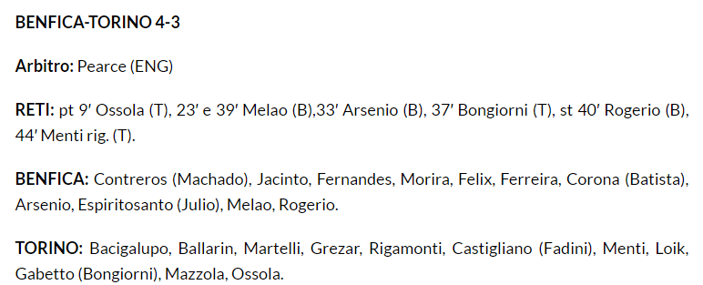 O primeiro quarto-de-hora ficou marcado pelo facto do Benfica não ter cumprido o acordo pré-estabelecido. Para não ficar a jogar 40 minutos com dez futebolistas fez entrar Vítor Baptista para o lugar do lesionado Julinho. Incompreensível num Clube de valores e princípios acima de toda a suspeita. Respeitado por se dar ao respeito. Em 1949 era assim! Compreensível perante o poderio do adversário. Era goleada pela certa. Mesmo a vencer por 3-2. Em 40 minutos ia ser um sufoco. A quebra do pacto de honra só se justifica porque o Benfica mostrou ter medo do adversário. e quebrou o compromisso. Não sendo um gesto correcto serve para elogiar o AC Torino. O poderio. Eu como adepto, em 2016, peço desculpa (vale apenas isso, simbolicamente) ao AC Torino pelo facto do Benfica não se ter portado à altura. Mas voês eram muito fortes. Fortes de-mais!
