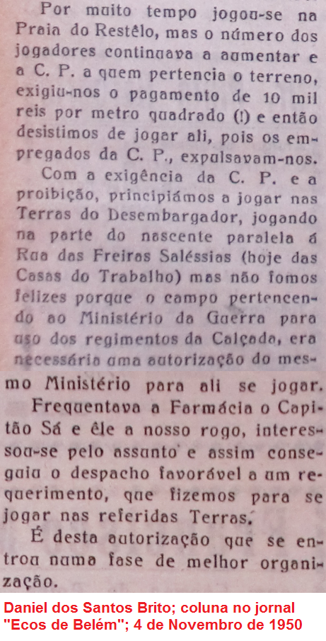 a jogar nos terrenos exteriores atrás do bairro e até ao rio. Começaram primeiro no terreno da antiga rua do Cais (depois e agora, ainda, rua Vieira Portuense), depois na Praia de Belém (onde está na actualidade a Praça do Império, em frente ao Mosteiro dos Jerónimos), à beira do rio, no terreno entre a doca de Pedrouços e a doca de Belém e depois - e finalmente (ou quase...) - na Praia do Restelo, na rectaguarda da Quinta da Praia do Duque de Loulé entre o muro das traseiras desta e a linha férrea. Os amplos areais de