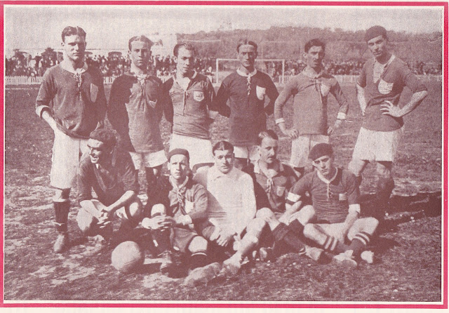 | No nosso campo de Benfica, inaugurado em 11 de Novembro de 1917 (que foi assinalado neste blogue - clicar) uma Gloriosa Equipa orientada por Cosme Damião. De cima para baixo. Da esquerda para a direita: António Ribeiro dos Reis (capitão), José Pimenta, Fernando Jesus, António Pinho, Alfredo Mengo e Carlos Sobral (que teria uma «vida inacreditável» - clicar); Herculano Santos, Artur Augusto, Clemente Guerra, Vítor Gonçalves e Jesus Crespo |