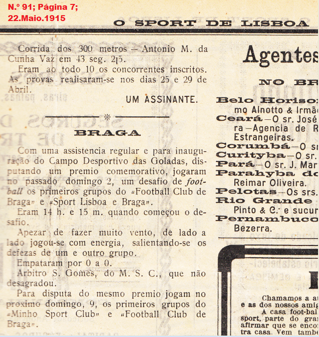 | Em 3 de Abril de 1927, a estreia do «Glorioso» em Braga e logo frente ao SC Braga, eliminando por 4-3 o clube braguista do «Campeonato de Portugal» nome inicial da «Taça de Portugal». No campo da Ponte. Para ver mais (clicar) para o Diário de Lisboa |