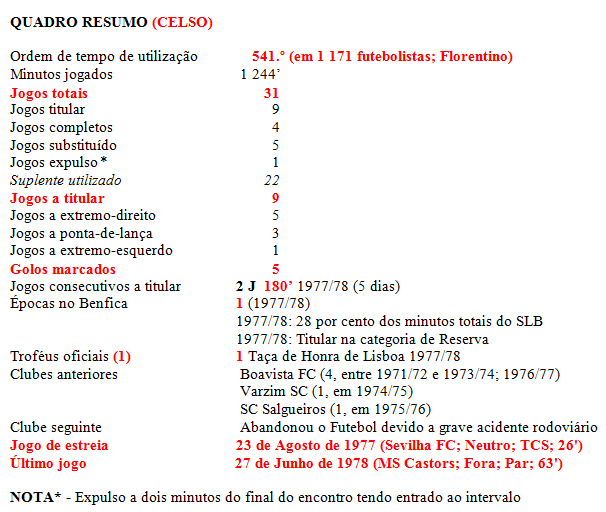 Celso teve a honra e o gosto de jogar de Águia ao peito. Jogou num período em que o SLB tinha grandes jogadores e grandes equipas. Soube brilhar e com certeza que com tempo teria mais condições e oportunidades para brilhar. Ao invés, o destino deu-lhe um lugar ao lado de casos infelizes de jogadores perdidos para o futebol por razões trágicas. Entrou numa galeria triste mas ilustre: Luciano, Augusto Silva, Artur Correia, Vítor Martins, e outros que agora não me lembro.