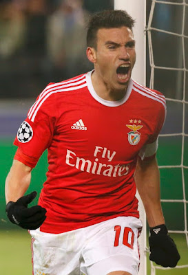 qualquer coisa” se não entrasse directo. Ele percebeu o que podia resultar porque após o remate caiu na grande-área - correu para a zona central - quando estava a jogar na ala esquerda, pois Jonas ainda estava em campo, além de Salvio, mas este estava (e bem) a apoiar Raúl pois foi do seu lado o remate. Um grande jogador. Não lhe peçam é