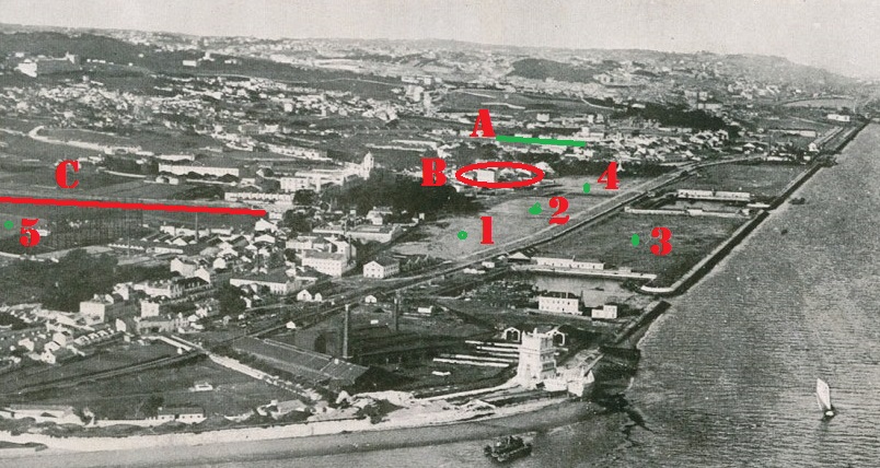 Onde tudo se passou e rapidamente. A - Terras do Desembargador, às Salésias onde se jogava. Foi nesse espaço, em finais de 1903, que o Football Club (Belém) perdeu com o Grupo dos Pinto Basto/FC Swifts e foi nesse mesmo espaço que o mesmo grupo reforçado com casapianos da "Associação do Bem" os venceu e na euforia da vitória foi decidido fundar um clube, o "Glorioso"; B - o bairro de Belém (com o prédio da Farmácia Franco e o seu pátio interior, o Café do Gonçalves e o António das Caldeiradas) muito maior que na actualidade pois parte dele foi desmantelado para fazer a "Exposição do Mundo Português", em 1940; C - A "Cerca da Casa Pia" onde treinavam aos domingos, os ex-alunos da Real Casa Pia de Lisboa e onde Gourlade os foi procurar para reforçar o Football Club no jogo-desforra com o FC Swifts; 1 - O local de treinos mais utilizado, entre as traseiras da Casa da Praia do Duque de Loulé e a linha férrea; 2 - os terrenos em frente ao Mosteiro dos Jerónimos problemático por conflituar com o Jardim fronteiriço ao Mosteiro; 3 - Os areais entre docas para lá da linha férrea (em 1903/1904) menos regularizados que aquando desta fotografia que é posterior; 4 - Os terrenos menos utilizados por conflituarem com o Palácio de Belém e a azáfama do bairro que incluía um importante mercado especializado em ter bom peixe; 5 - Os terrenos do Hipódromo de Belém (citados por Eça de Queirós, em "Os Maias") embora excelentes - até mais para o Futebol que para as "Cavaladas" - ficavam pouco acessíveis